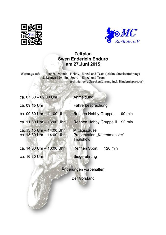 Das Enduro in Zwönitz erfreut sich jedes Jahr größerer Beliebtheit. Die Vornennungen sind nun überraschend so gut das man sich kurzfristig auf einen neuen Zeitplan für Morgen einigen musste.