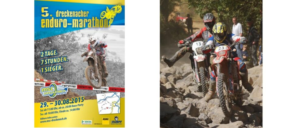 Der MSC Dreckenach startet in diesem Jahr zum fünften mal den Enduromarathon hier in der Nähe von Koblenz an der Untermosel. 2 Tage mit 7 Fahrstunden bieten Enduro vom feinsten, die Strecke geht über 6 km durch ein anspruchsvolles Gelände, ergänzt durch mehrere Waldstücke. Nach jedem der insgesamt 3 Läufen mit je zwei Stunden wird die Strecke verändert und nur die Besten kommen in den einstündigen Endlauf „Never come Back“. Punkte sammeln heißt es in den ersten drei Läufen. Für die Grundrunde gibt es 20 Punkte. Im Streckenverlauf gibt es Sonderprüfungen „no help zone“ wie Steilauffahrten, Steinfelder und Trialeinlagen in der Extra Punkte gesammelt werden . Die SPs sind kein muß also können auch nicht ganz erfahrene Enduristen entspannt ihre Runden drehen. Der Fahrer mit den meisten Punkten darf im Finale zuerst starten der Rest mit jeweils 2 Sekunden Abstand.