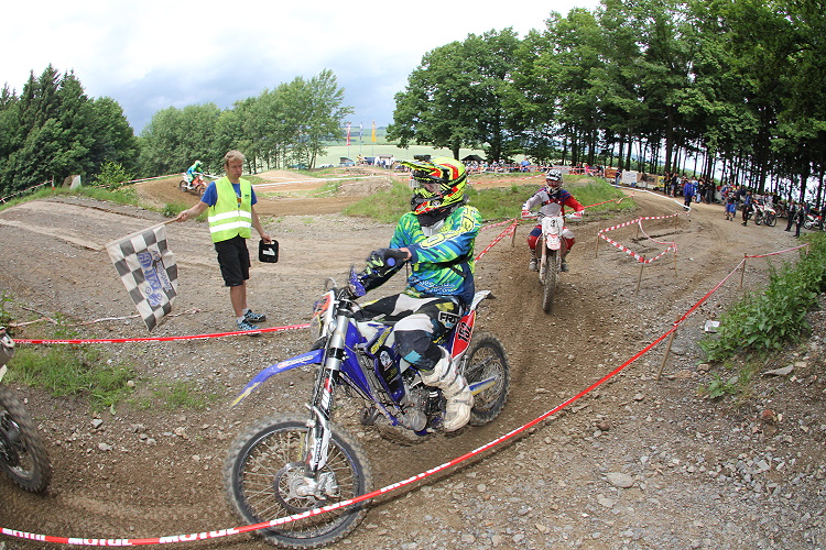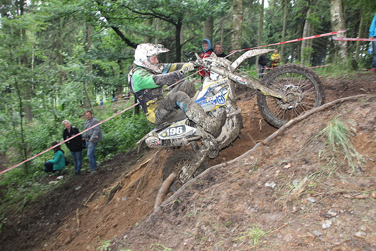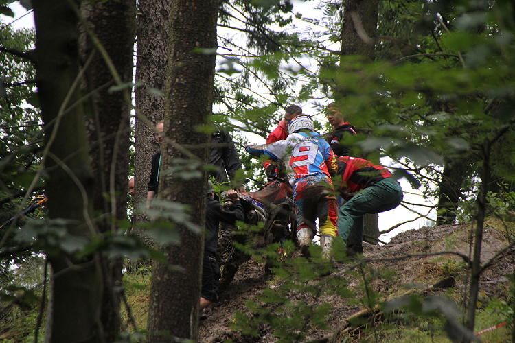 Die Hobbyklassen fuhren zunächst auf einer einfacheren Runde. Diese ging im Uhrzeigersinn über die MX Strecke und den angrenzenden Waldstück. Wie im letzten Jahr mit vielen Auffahrten versehen. Trotz leichten Nieselregens hatten die Einzelfahrer des ersten Laufes die besten Bedingungen.