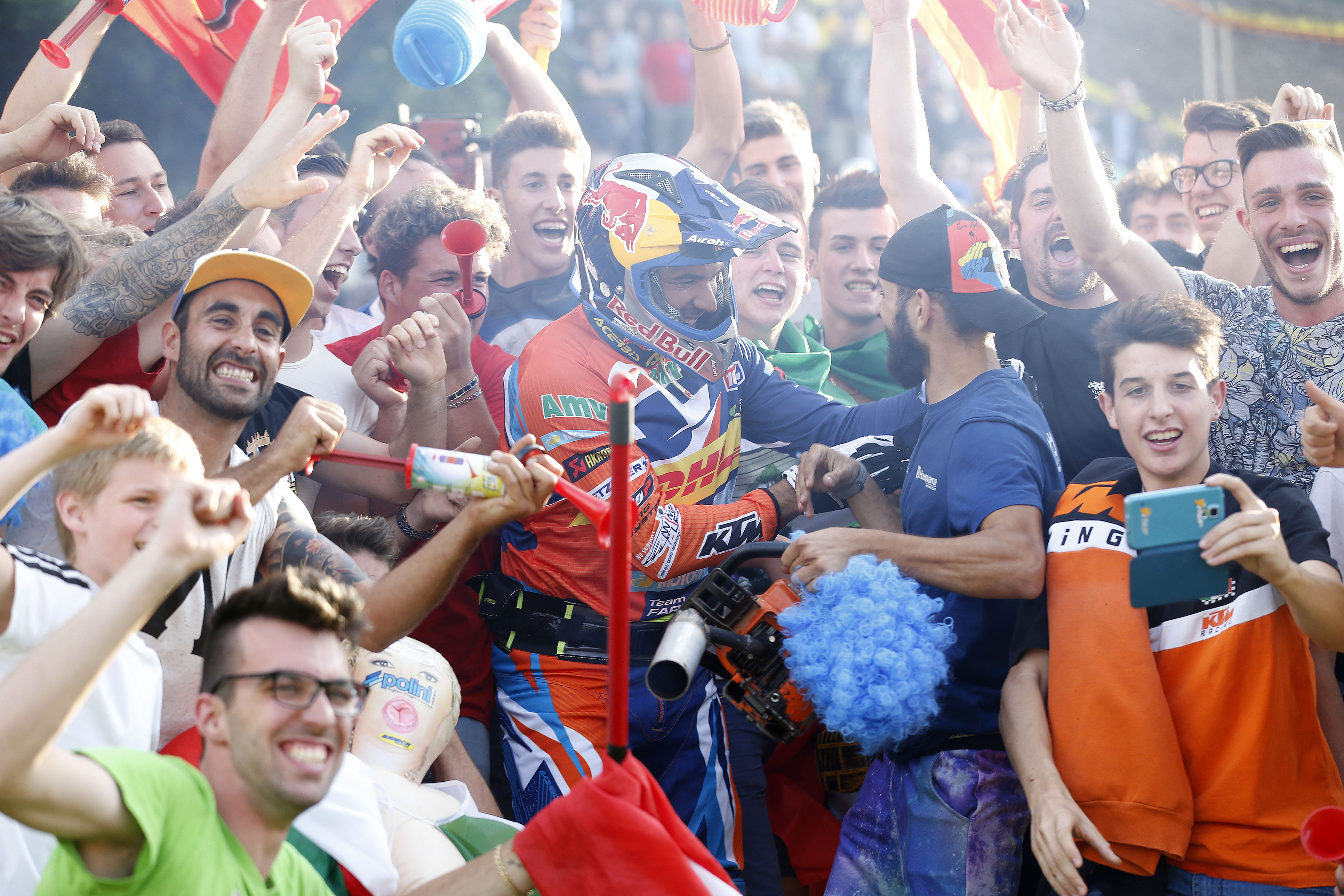 Bereits der KTM Super-Test am Freitagabend zeigte, dass es der Moto Club Bergamo versteht eine Veranstaltung dieser Art zu organisieren. Das Italiener wissen wie man feiert, ist bekannt und muss nicht weiter unterstrichen werden. Andere Nationen könnten sich von der Stimmung an der Strecke, allerdings eine große Scheibe abschneiden, denn bereits zum Auftakt am Freitagabend säumten italienische Flaggen, Kettensägen in „Dauervollgas-Stellung“ und 5.000 unfassbar frenetisch jubelnde Tifosis die Strecke … Alle wollten nur eines, ihre italienischen Helden um Alex SALVINI (Honda), Thomas OLDRATI (HVA – Bergamo), Simone ALBERGONI (Kawasaki – Bergamo), Rudy MORONI (Sherco – Bergamo), Giacomo REDONDI (Beta – Bergamo) oder Davide SORECA (Beta) anfeuern. Aber es war ein Franzose Namens Mathias Bellino der dieser italienischen Armada die Show stahl. Der Husky-Werkspilot konnte diesen Test trotz einiger Fahrfehler, bereits zum Dritten Mal in dieser Saison für sich entscheiden. Bellino überquerte die Ziellinie mit einer Zeit von 1´27″60 vor seinem Rivalen Matthew PHILLIPS (AUS-KTM) der eine Zeit von 1´27″61 in die Tabelle stampfte. Ein unglaubliches Duell unter vielen anderen…