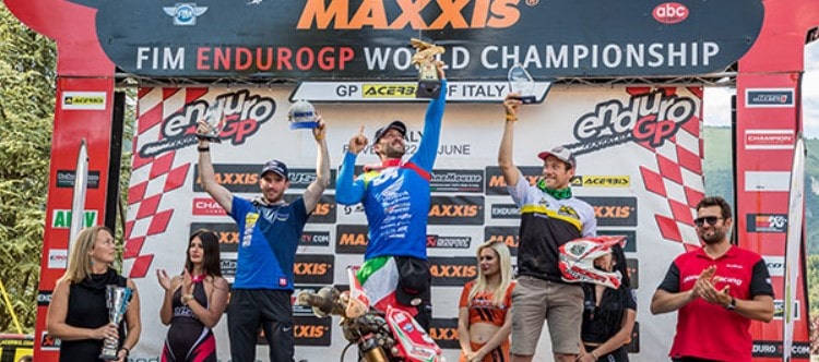 Alex SALVINI (ITA-Honda) bewies einmal mehr, dass er immer noch einer der Top-Guns in Enduro ist, indem er den Schmerz seiner ausgekugelten Schulter abwehrte, „Rocky“ gewann seinen Heim-GP vor einer begeisterten Menge. Dieser Sieg bedeutete dem Honda-Fahrer so viel, dass er in E2 und EnduroGP Höchstpunkte erzielte. Als SALVINI an der Ziellinie emotional wurde, brach er zusammen und stützte sich auf seine „tifosi“ (Heimfans), um Unterstützung zu erhalten. Der Bologneser siegte deutlich über seine Gegner – er lag mehr als 42 Sekunden vor dem Zweitplatzierten: Loic LARRIEU (FRA-TM).