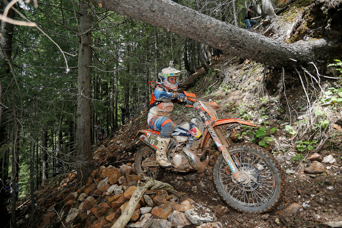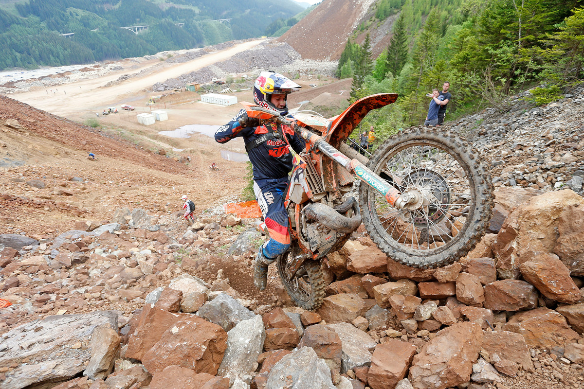 Deutlich fahrbarer sollte der Kurs in 2016 werden, so hatten es die Macher versprochen. Ob dies mit 9 Fahrern im Ziel erreicht wurde? Das bleibt wohl für immer ein Geheimnis. Mit Abschnitten namens Machine, Badewanne, Carls Diner, Downtown, Dynamit oder auch Lazy Noon erwies sich der neue Kurs als sehr anspruchsvoll. Selbst erfahrene Piloten mussten hier an ihre Grenzen gehen und sich dem Berg geschlagen geben. Wie immer galte es, schnell vom Start wegzukommen und die ersten Schotterauffahrten zu meistern um sich von der breiten Masse abzusetzten. Dem fünffachen Erzberg-Sieger Taddy Blazusiak (POL) gelang dies am besten, denn er übernahm (zunächst) die Führung, wurde aber bald von Cody Webb (USA) abgelöst. Es kristalisierte sich eine Spitzengruppe um Webb, Blazusiak, Alfredo Gomez (SPA) und Wade Young (RSA) heraus.