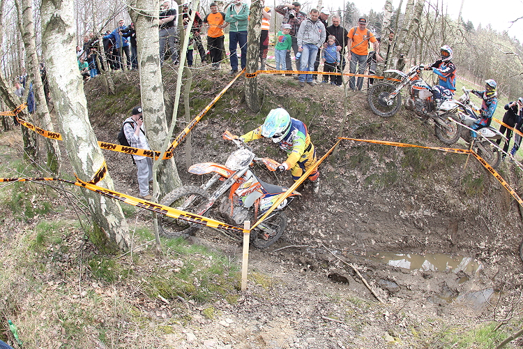 Damit es sich am ersten Hang nicht zu sehr staute, hatte man die Schlüsselstelle gleich aus der Strecke herausgelassen. Erst in Runde 2 gab es Action an einer kurzen aber doch sehr anspruchsvollen Auffahrt. Die Probleme sollte es aber dann doch in Runde 1 gleich geben, nämlich am zweiten Highlight. Ein Graben mit einer spitzen steilen Ausfahrt sollte das Feld etwas auseinanderziehen. Dirk Peter als erster Fahrer scheiterte aber an dieser Schlüsselstelle, deshalb nutzten alle Fahrer im Gesamten Rennen eine Umfahrung.