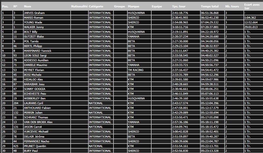 Zu diesem Zeitpunkt war Jonny Walker bereits außerhalb jeder Siegchance, denn er hatte sich in der zweiten Runde an einem Abzweig verfahren und verlor dadurch soviel Zeit das es nur zu Platz 4 reichte. Auch sein Teamkollege im KTM Factory Team Alfredo Gomez schied nach einem Defekt vorzeitig aus. Der Spanier hatte am Samstag noch den Prolog in der Altstadt von Ales gewonnen.