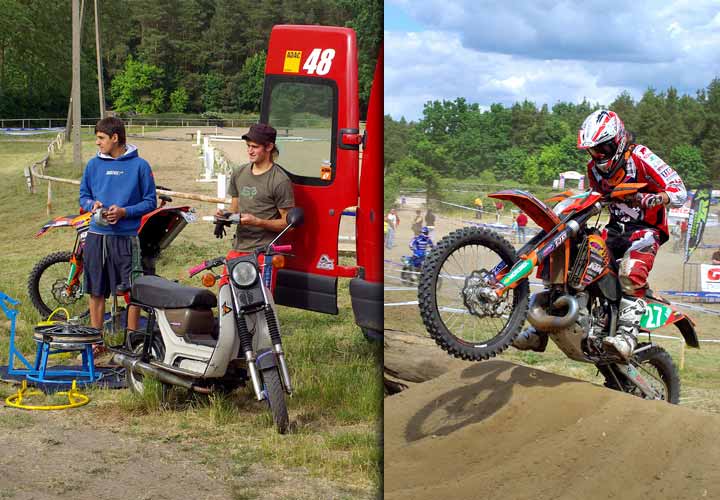 Ehrgeiz, ganz klar! Und einfach den Mut zu haben, sich mit den Besten messen zu wollen, dabei aber immer eine gesunde Selbsteinschätzung zu wahren. Letztendlich brauchst du relativ wenig, um einen WM-Lauf zu bestreiten. Klar musst du viel reisen. Aber ob du jetzt zu Hause jedes Wochenende 200 Kilometer zum Training fährst, für nichts, für kein Rennen, weil die Meisterschaft erst im Frühherbst fortgesetzt wird oder eben mal 1000 km zum WM-Lauf nach Italien, um einfach mal hinein zu schnuppern, macht keinen großen Unterscheid. Ich würde sogar behaupten, an einem WM-Wochenende lernt man sogar um ein Vielfaches mehr! Ich kann nur empfehlen, einfach mal loszufahren und es probieren. Anders habe ich auch nicht begonnen. Ich war damals 20, als ich mit meinem Bruder Julius, der erst 16 geworden war, zum WM-Lauf nach Polen gefahren bin. Wir haben alles komplett alleine organisiert, zusammen geschraubt uns alles vorbereitet. Und das ging auch! Ich bin gefahren und er hat die Betreuung übernommen, ist mit dem Simson-Roller und dem Benzin-Kanister zwischen den Beinen zwischen ZK und Prüfungen gependelt. Er hat damals mindestens genau so gekämpft, wie ich damals auf der Strecke! (lacht)