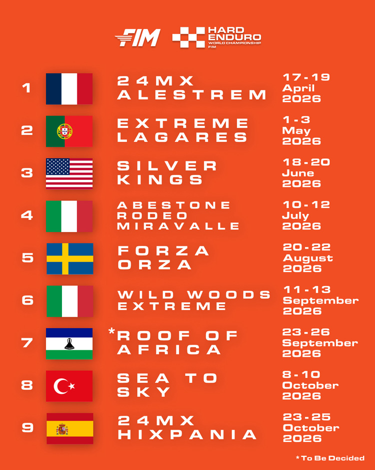 Die FIM Hard Enduro World Championship (HEWC) hat offiziell ihren Kalender für die Saison 2026 bestätigt – und der kann sich mehr als sehen lassen. Neun Läufe, verteilt über Europa, Afrika und Nordamerika, sorgen für eine echte Weltmeisterschaft im HardEnduro. Von April bis Oktober wartet ein gnadenloser Mix aus legendären Klassikern, neuen Austragungsorten und brutal anspruchsvollem Gelände auf Fahrer, Teams und Fans.