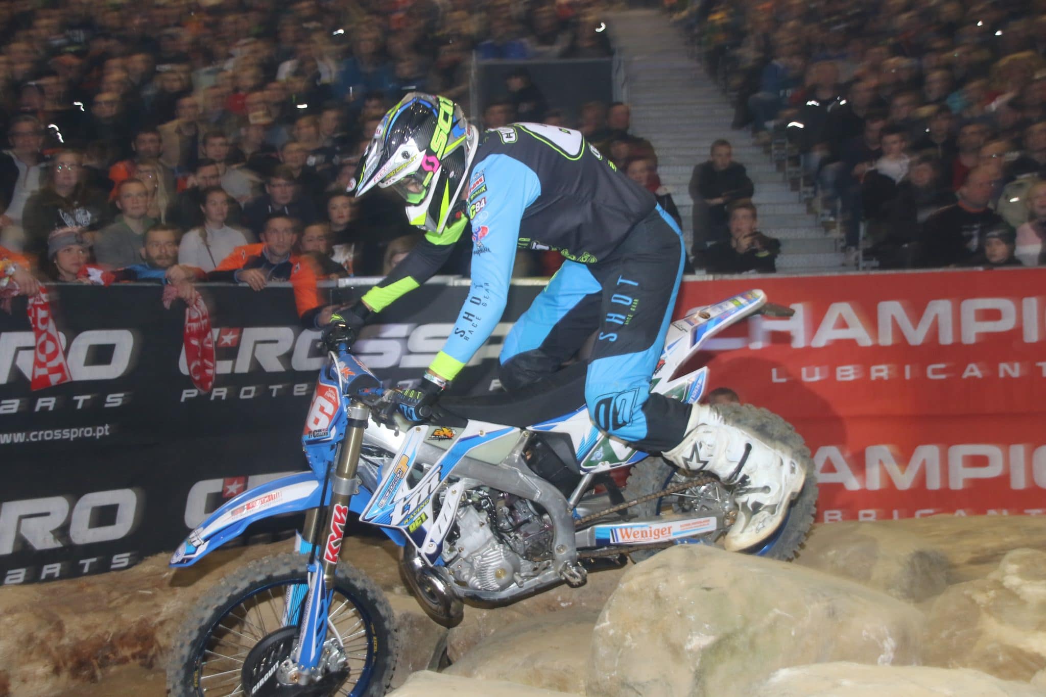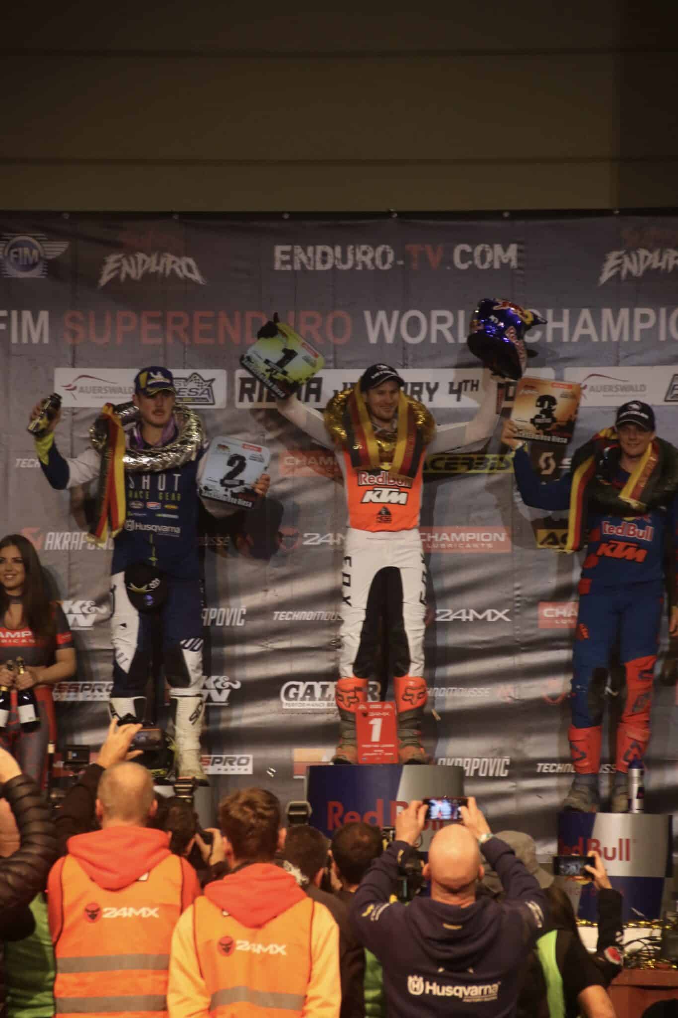 Ein rundherum erfolgreicher Tag liegt hinter den Fans, Fahrern und vor allem den Organisatoren der Eventmanufaktur Auerswald. Die ausverkaufte SachsenArena in Riesa war Austragungsort des zweiten Saisonlaufes der FIM Superenduro Weltmeisterschaft. Viel Lob gab es vor allem für die Strecke, welche erneut von Holger Dettmann und seinem Team gebaut wurde. Viele neue noch nie im Superenduro verbaute Elemente waren in die Strecke integriert. Vor allem eine Brücke mit einer Steinauffahrt sorgte für so manche spektakuläre Scene.