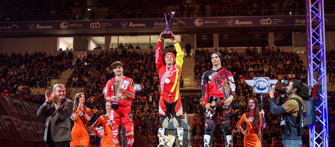 Sofia, 12. Dezember 2015: Am Samstag stieg das große NIGHT of the JUMPs WM Finale in der Armeec Arena in Sofia. Vor der finalen Runde der FIM Freestyle MX World Championship lagen die WM-Kontrahenten David Rinaldo (FRA) und Maikel Melero (ESP) nur zwei Punkte auseinander. Und es sollte bis zur letzten Sekunde der diesjährigen WM spannend bleiben.