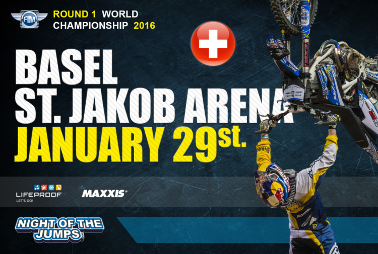 Am 29./30. Januar 2016 feiert die Night of the Jumps ihr 10-jähriges Jubiläum in Basel! Zum 10. Mal stürmen die Freestyle Motocross Sportler der NIGHT of the JUMPs bereits die St. Jakobshalle. Auch 2016 kommt die extremste FMX Sportserie der Welt wieder mit zwei Wettbewerben der FIM Freestyle MX World Championship in die Schweiz. Doch damit nicht genug. Zum ersten Mal wird in Basel die Weltmeisterschaft eröffnet.
