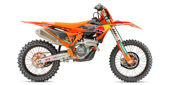 Natürlich dürfen die legendären Red Bull KTM Factory Racing Grafiken nicht fehlen – kombiniert mit einem orangefarbenen FACTORY EDITION Rahmen, schwarzen Rädern und dem markanten orangefarbenen Werks-Sitz. Ob an der Startlinie oder im Fahrerlager: Diese Bikes schreien förmlich nach Sieg.