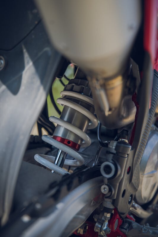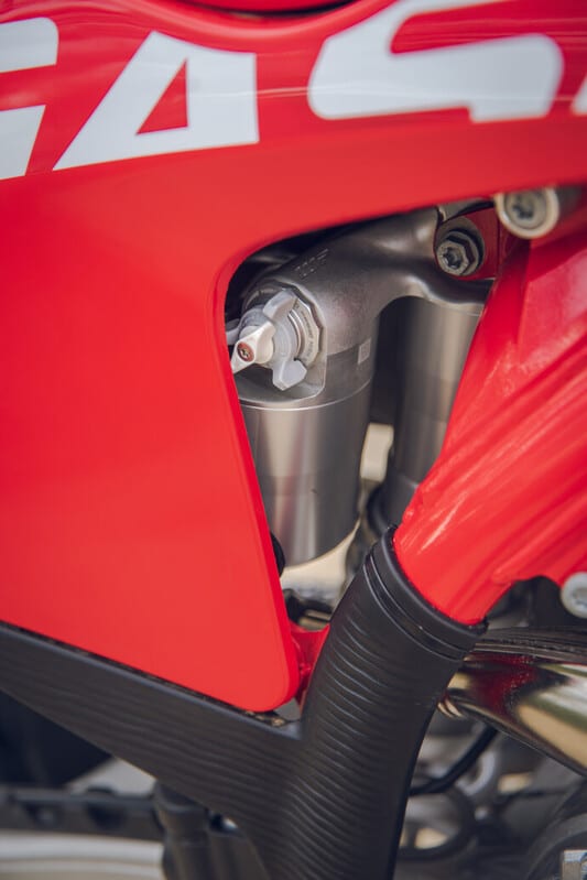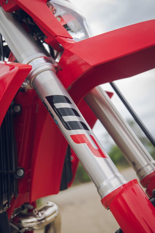 - WP XACT-Federbein mit Anlenkung: Das WP XACT-Federbein ist kürzer und leichter, hat aber trotzdem 300 mm Federweg und einen neuen Kolben für mehr Komfort. Und um sicherzustellen, dass das Federbein immer gleichmäßig und progressiv bleibt, sind alle GASGAS-Enduros mit einer Anlenkung ausgestattet.