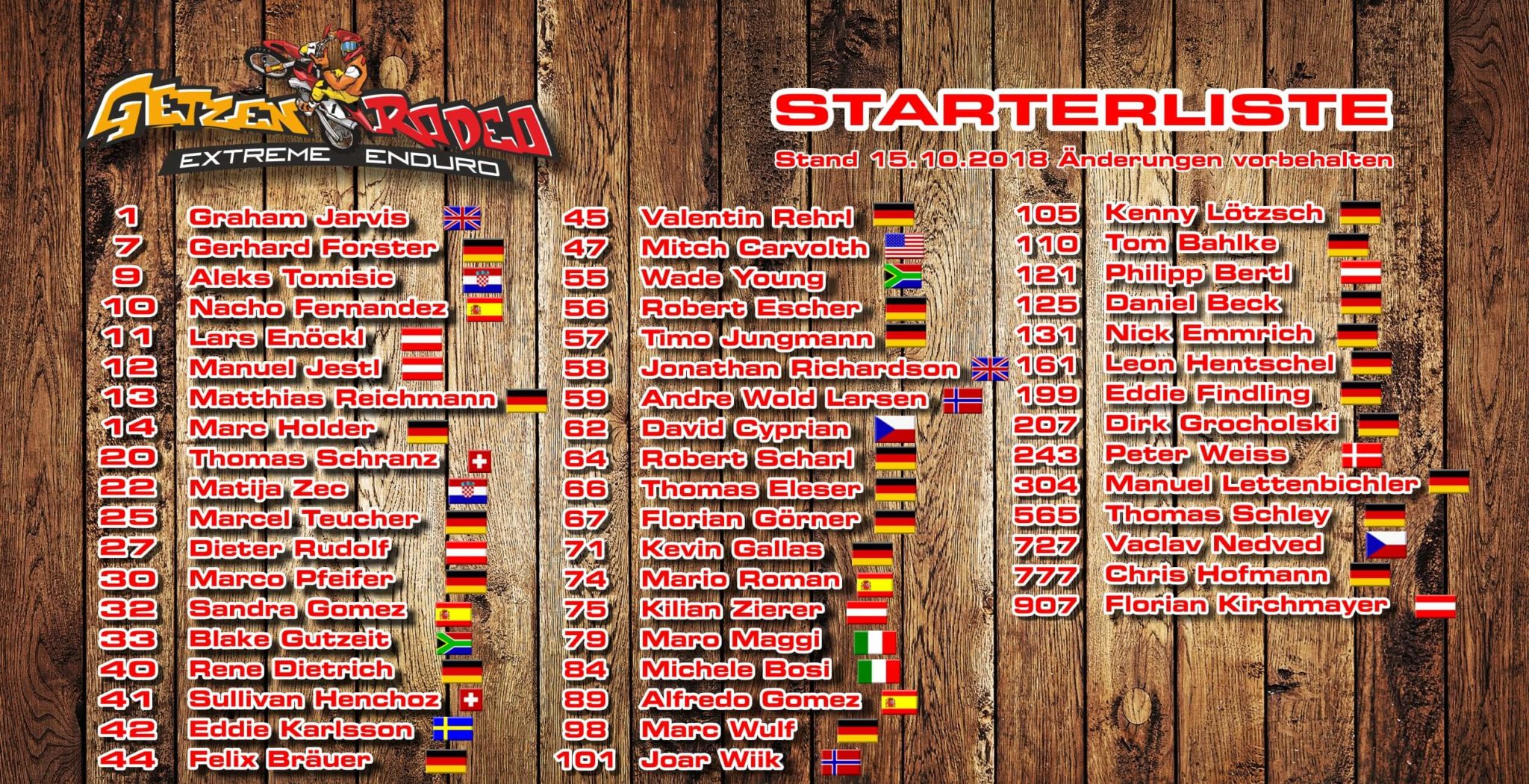 An der Spitze der Starterliste steht erneut Graham Jarvis. Der dreimalige Gewinner will erneut aufs oberste Podium und damit seine Erfolgsserie weiter ausbauen. Seine ärgsten Gegner werden die Spanier Mario Roman und Alfredo Gomez werden, diese drei standen auch am letzten Wochenende beim Hixpania gemeinsam auf dem Podium. Erstmals im Erzgebirge dabei ist Wade Young, der Südafrikaner kommt mit einem Sieg vom Sea to Sky ebenfalls hochmotiviert ins Erzgebirge. Große Chancen rechnet sich auch Manuel Lettenbichler aus, der Kiefersfeldener brennt auf das Getzenrodeo um vor dem Deutschen Publikum um den Sieg zu fahren. Fahrer aus 13 Ländern werden teilnehmen.