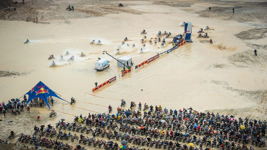 Preschten die Fahrer am Start noch mit aufheulenden Motoren durch das knietiefe Wasser, blieben