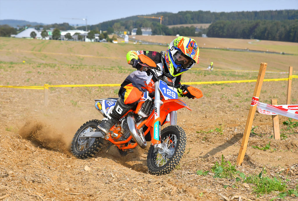 Der Renntag begann traditionell mit den jüngsten Teilnehmern. Die Klassen 50, 65 und E-Bikes eröffneten das Rennen und mussten sich auf einer großen Ackerfläche mit anspruchsvollen Sonderprüfungen beweisen. In der Klasse 50 konnte Tim Tränkner aus Großolbersdorf nahtlos an seine starke Leistung aus dem letzten Rennen in Flöha anknüpfen. Er setzte sich nach sechs Runden souverän gegen den Tabellenführer Mika Klose aus Riesa durch, sodass der Kampf um den Gesamtsieg nun wieder völlig offen ist. Das Podium komplettierte Liam Paul aus Mitteleschenbach.