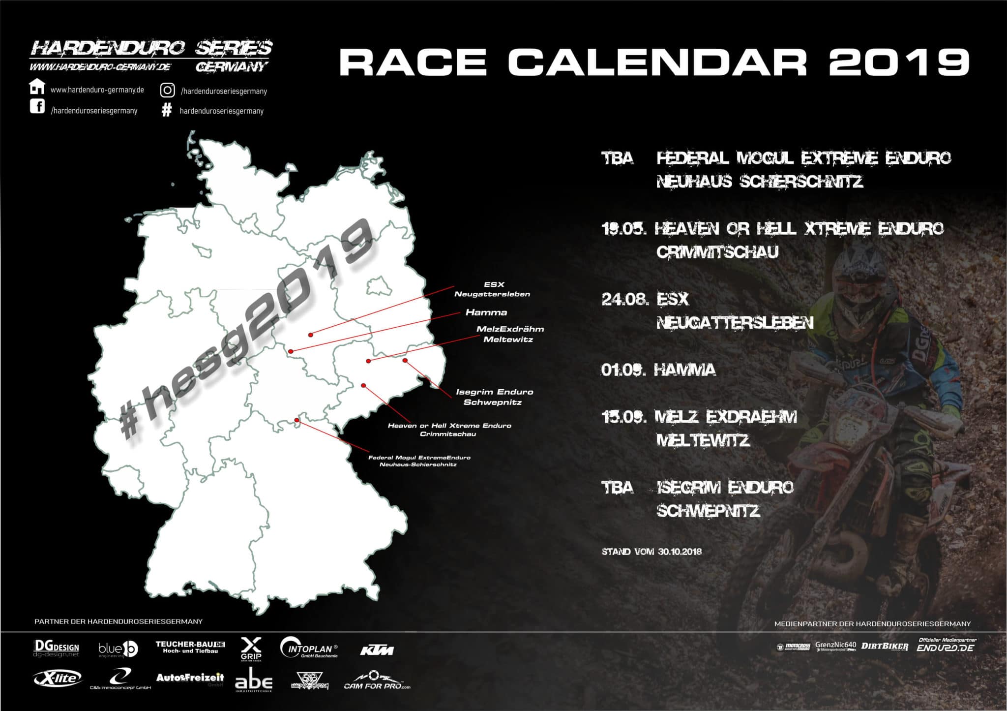 Paukenschlag, vier Tage vor dem Saisonfinale 2018 in Schwepnitz gibt das HardEnduroSeries Germany Serienmanagement einen ersten Ausblick auf die Saison 2019. „Wir wollen unsere Termine so früh wie möglich bekannt geben, so kann jeder rechtzeitig planen. Das die ersten Termine noch vor dem Finale am Samstag in Schwepnitz feststehen ist natürlich sehr gut. Priorität hat für uns das es keine Überschneidungen mit den bekannten Extremenduro Events in ganz Europa gibt.“ sagt Denis Günther.