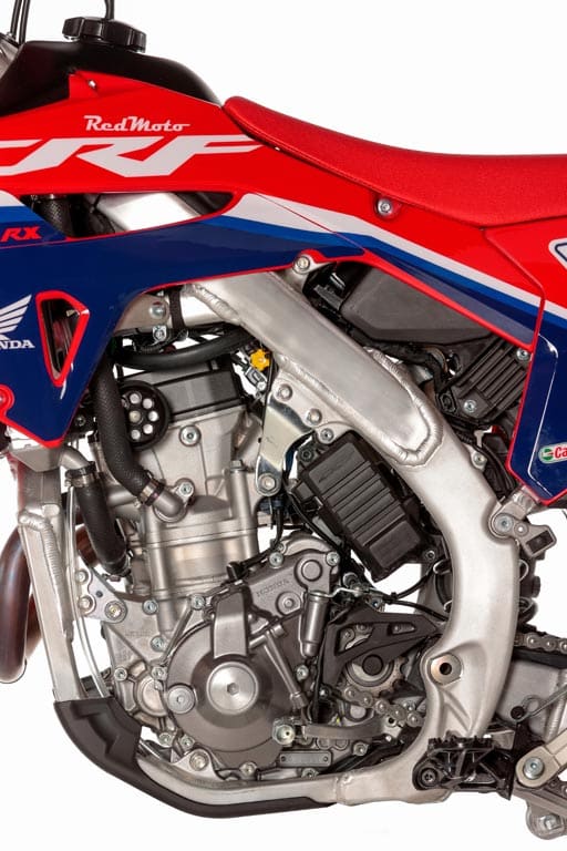 Für das Modell 2022 erhält der CRF400RX weitere Verfeinerungen und bietet dank der neuen ECU-Einstellungen und der neuen Showa-Aufhängungseinstellung, die die Balance zwischen Front und Heck verbessert, eine bessere Fahrdynamik. Der Rahmen bleibt unverändert und ist identisch mit dem der CRF450RX Enduro von Thomas Oldrati, Gewinner der Six Days 2021.