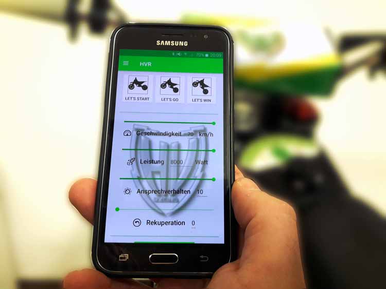 Der Antrieb liefert eine Spitzenleistung von bis zu 8000 Watt (ca. 11 PS) und sorgt für eine Maximalgeschwindigkeit von ca. 70 km/h. Das Motorrad kann mit dem Smartphone über die kostenlose Android HVR-Connect App in wenigen Augenblicken verstellt und an das Fahrkönnen des Nachwuchsrennfahrers angepasst werden.