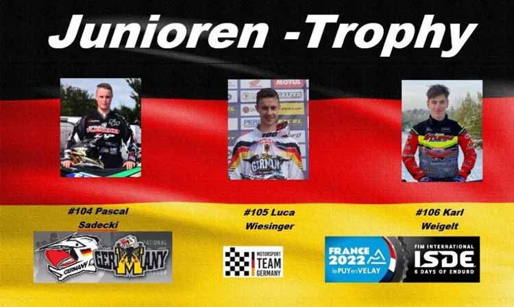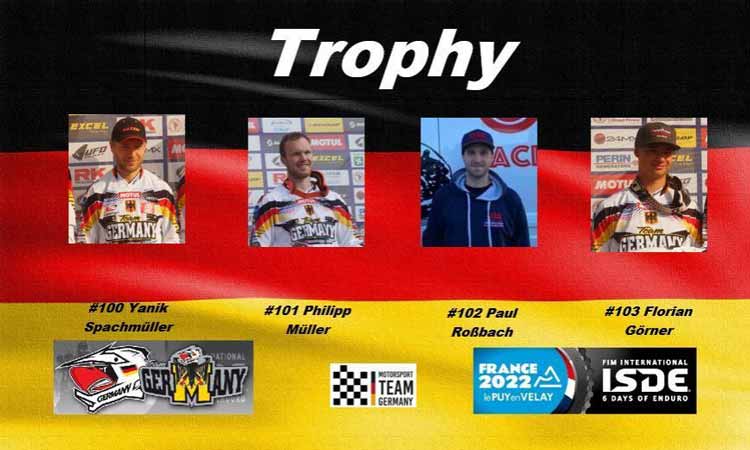 Als Ersatzfahrer konnte Davide von Zitzewitz nachnominiert werden, der sich nach überstandener Verletzung wieder zur Verfügung stellen wollte. Leider hatte Davide erneut einen Trainingsunfall, so dass er seine Teilnahme an der ISDE 2022 absagen musste. Nun wurde Philipp Müller für die Trophy in Frankreich nachnominiert.