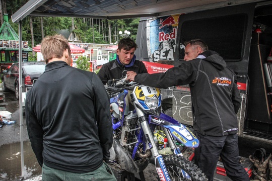 Im Ziel bemerkte er dann aber einen Schaden an der Zylinderkopfdichtung. Bis 20.00 Uhr war es noch nicht geklärt ob die Sherco wieder in Gang gebracht werden konnte. Erst durch die Hilfe von Benjamin Diesel konnten die richtigen Dichtungen eingebaut werden. Die Sherco steht nun wieder am ParcFerme und Marcus kann wie die anderen Teilnehmer Morgen um 9 Uhr auf die 50km lange Runde gehen.