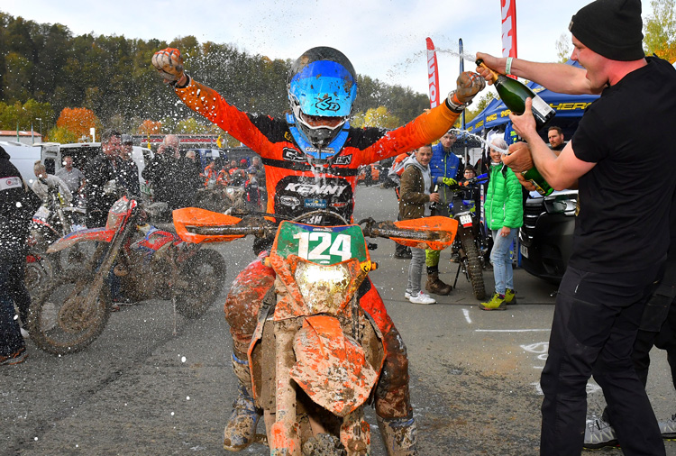 Ein weiterer Fahrer, der den Zuschauern in Erinnerung bleiben wird, ist Edward Hübner. Der KTM-Fahrer lieferte eine starke Vorstellung ab und belegte den vierten Platz in der Gesamtwertung sowie den zweiten Platz in der E2-Klasse. „Heute war ich nah dran an Davide, so nah, wie lange nicht“, sagte Hübner, der mit nur elf Sekunden Rückstand auf Davide von Zitzewitz ins Ziel kam. Zwei Stürze warfen ihn jedoch zurück und verhinderten den möglichen E2-Tagessieg. Trotzdem durfte er gemeinsam mit dem Team des ADAC Sachsen, bestehend aus Jeremy Sydow und Luca Fischeder, den Mannschaftssieg feiern.