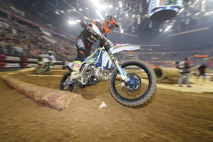 Auch im dritten Rennen startete der junge Deutsche sehr gut und hielt sich in der Führungsgruppe mit den Werksfahrern. Sein Fahrstil wurde immer sicherer, flüssig überwand er die unmittelbar aufeinanderfolgenden Hindernisse aus Baumstämmen, Reifen und Steinen. Er fand sichere Linien in dem sehr feuchten und unberechenbaren Untergrund, der ja nur eigens für diese Veranstaltung in die riesige Arena eingebracht wurde. Dass sein fünfter Platz im zweiten Rennen kein Zufallstreffer war, demonstrierte Gallas mit dem fünften Platz auch im letzten Finalrennen des Abends.