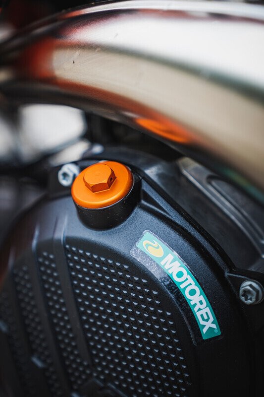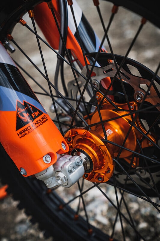 - Factory Radsatz mit schwarzen D.I.D-Felgen, schwarzen Speichen, orangefarben eloxierten Naben und orangefarben eloxierten Ventilnippeln