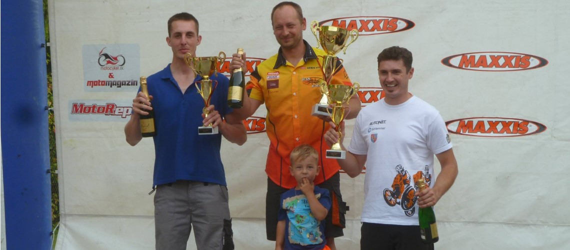 Armin: „Bei den 5 Stopps dieser Rennserie galt es je zwei Wertungstage zu absolvieren. Wir starteten in Ungarn, Kroatien, Bosnien und der Slowakei. Ich konnte mir mit zwei zweiten Plätzen bei den beiden Stopps in Ungarn, und meinen beiden Siegen in Kroatien und Bosnien ein gutes Polster für das letzte Rennen hier in der Slowakei sichern. Ein zweiter Platz hier hat nun für den Gesamtsieg in der E3 Klasse (300 ccm Zweitakt und 500 ccm Viertakt) gereicht. Ich bin überglücklich, hatte ich mir doch wenige Tage vor dem Rennen zu Hause eine tiefe Schnittverletzung an der Gashand zugezogen bei welcher ich mir die Sehnen zwischen Daumen und Zeigefinger durchtrennt habe. Es hieß also an beiden Renntagen, mehre Stunden lang auf die Zähne zu beißen. Schlussendlich konnte ich aber wirklich gute Zeiten in den slowakischen Boden brennen und wurde mit meinem zweiten Platz in Kosice zum Sieger in der Gesamtwertung gekürt. Ich kämpfte gegen wirklich schnelle Leute die unter anderem schon mehrfach an der Rally Dakar teilgenommen hatten. Zweiter wurde Richard Kubik aus Ungarn und dritter Emanuel Gyenes aus Rumänien.
