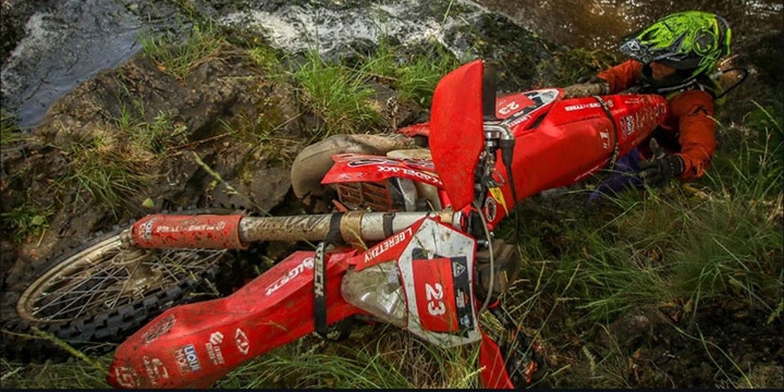 Der erste Renntag brachte eine gemischte Strecke aus den härtesten Abschnitten der beiden geplanten Tage. „Das bedeutete doppelten Schwierigkeitsgrad“, erklärt Lenny. Besonders herausfordernd war ein großes Bachbett in einem Canyon, das durch einen rutschigen Schmierfilm extrem schwierig zu befahren war. Trotz dieser Hindernisse gelang es Lenny, bis zum Servicepoint gut durchzukommen.