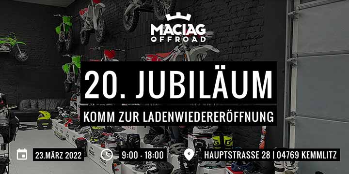 Am 23.03.2002, also vor genau 20 Jahren gründete Mike Maciag „Maciag Offroad“ in Kemmlitz als kleines Ladengeschäft. Heute hat sich das Unternehmen zu einem der führenden Fachhändler für den Zweirad Offroad Sport, mit 90 Mitarbeitern an drei Standorten in Europa entwickelt.