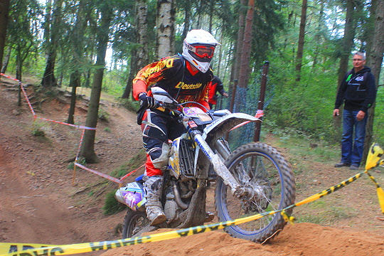 Auch Christian Brockel kam nich problemlos um den anstrengenden heutigen Tag. Auf dem Test in Zwönitz legte er sich direkt nach dem Start hin und mußte zunächst auch langsam die Prüfung weiterfahren. Zum Glück ist ihm und den Motorrad nichts schlimmeres passiert sodaß er Morgen wieder angreifen kann.