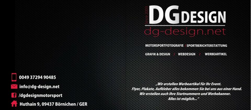 Als Full Service Anbieter ist DG Design keine spezialisierte Eventagentur oder Werbeagentur. Sie bieten einen Mix aus allen und gestalten die notwendigen Drucksachen (Ankündigungs- und Werbemittel wie Plakate, Flyer und Mailings) und platzieren die entsprechende Werbung. Außerdem sind Kontakte zu wichtigen Mediapartnern, allen voran der größten Deutschen Endurowebseite www.enduro.de vorhanden, und kümmern sich ebenfalls um Ihre Berichterstattung in Form von Pressemeldungen und Fotos.