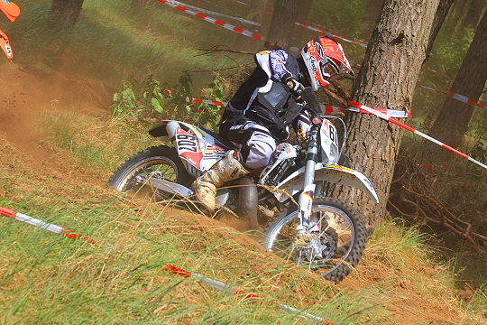 Die Sonderprüfung hatte durchaus Endurocharakter. Durch den Tiefsand verwandelte sich der Test jede Runde. Die einzige Spur im Waldstück wurde immer tiefer. Da es im Waldstück sehr eng was, wurden die schnellen Fahrer immer wieder von langsamen aufgehalte.