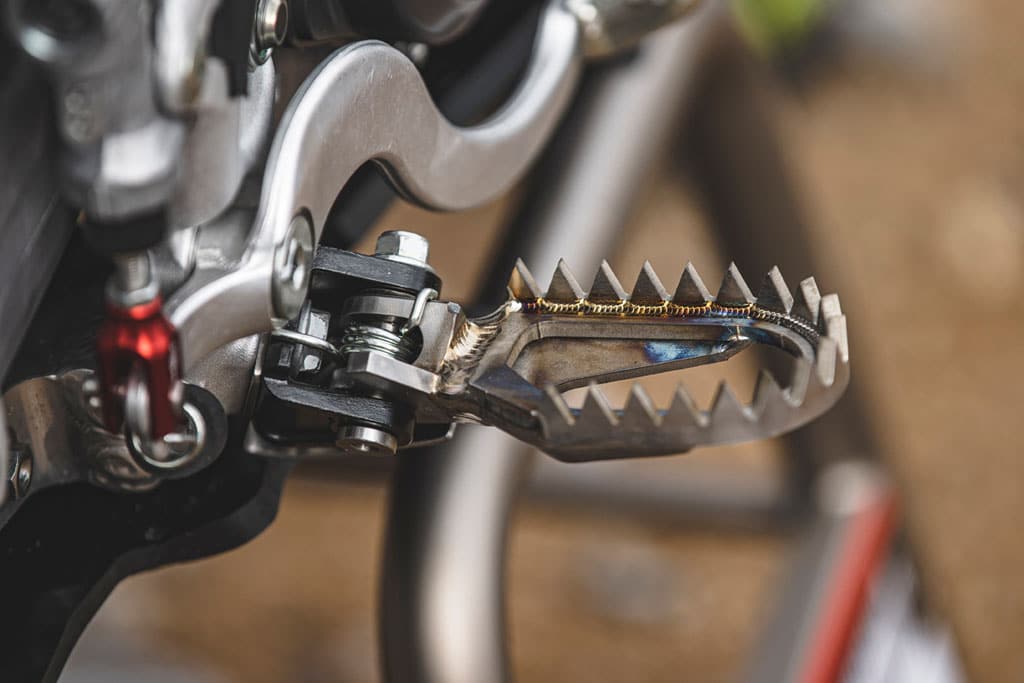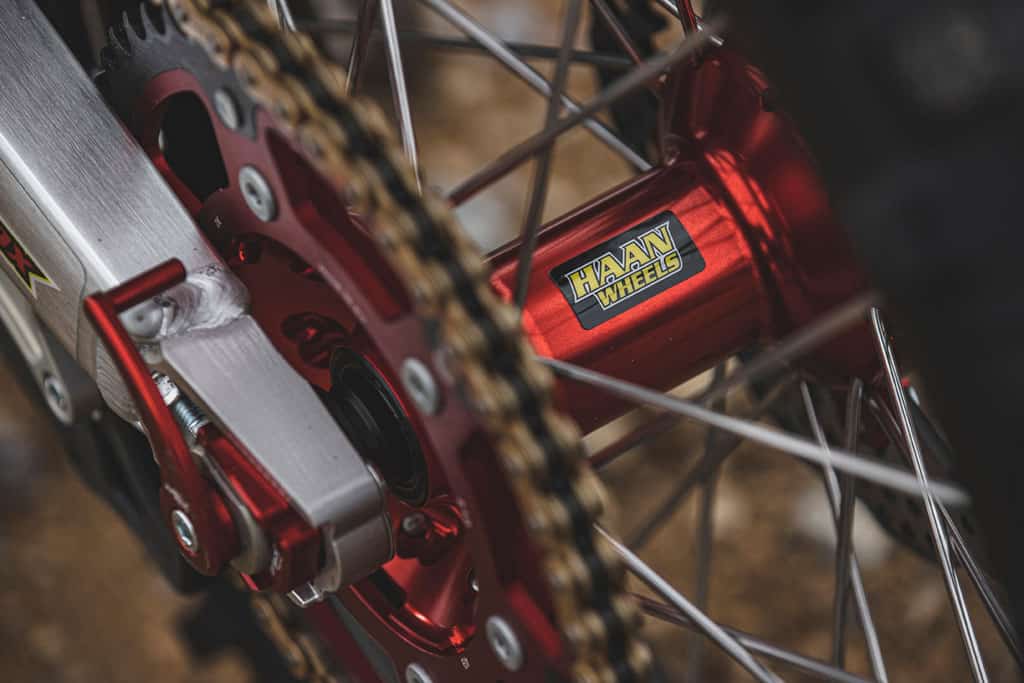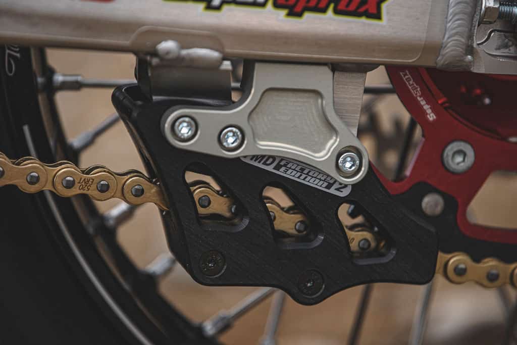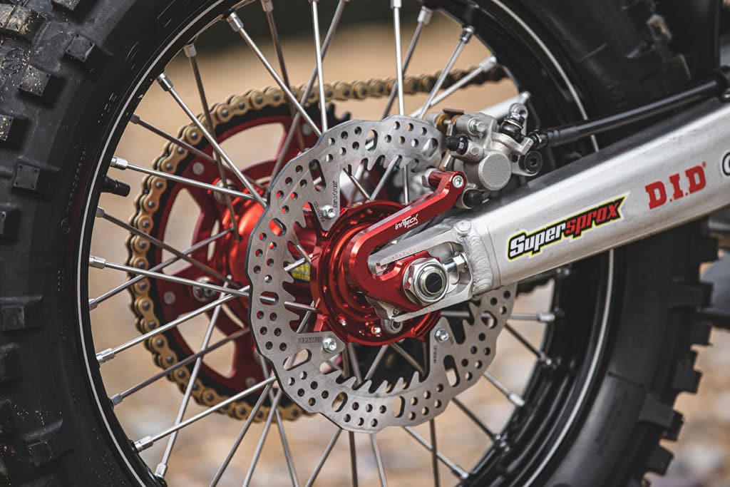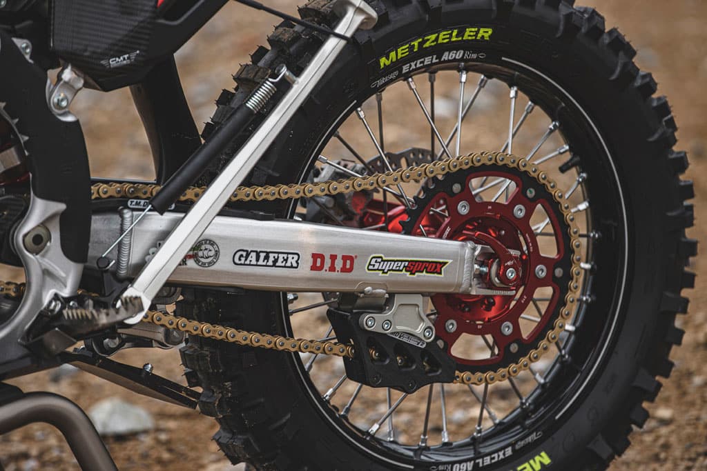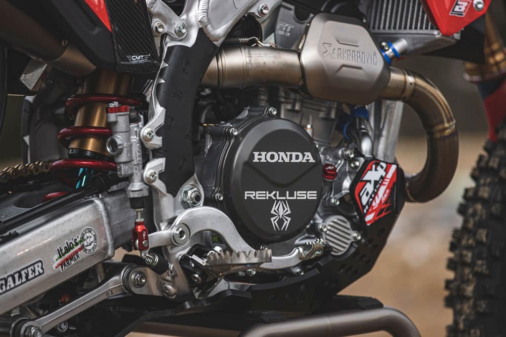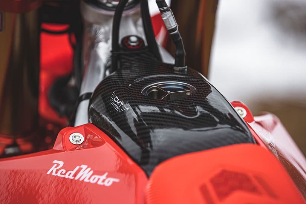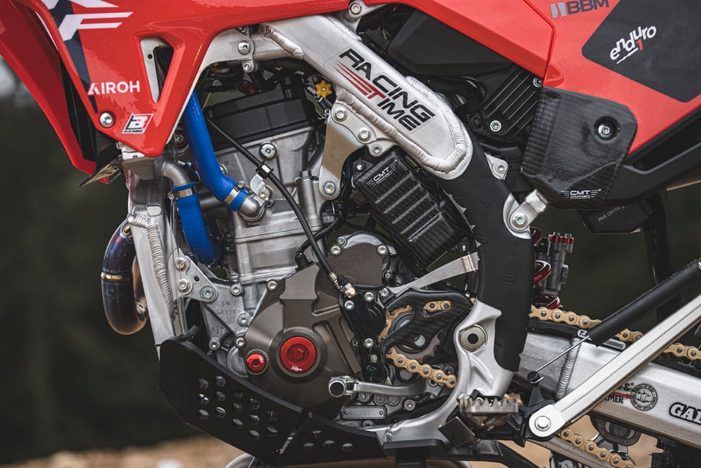 Das Honda RedMoto CRF 250RX Enduro ist Steve´s Waffe für die Herausforderungen der Saison 2024, sowohl in der EnduroGP Weltmeisterschaft als auch in der italienischen Enduro-Meisterschaft. Dieses Bike ist nicht nur ein Hingucker, sondern auch technisch bis in die letzte Schraube perfektioniert. Die Ausstattungsliste liest sich wie der Wunschzettel eines jeden Enduro-Fans: Von Akrapovic-Auspuffanlagen über Acerbis-Kunststoffteile, GET-Elektronik, Showa-Fahrwerken, Galfer-Bremsen, Supersprox-Kettenrädern, AXP-Motorschutz, Metzeler-Reifen und -Mousses bis hin zu XTrig-Gabelbrücken, Vertex-Kolben, CMT-Karbonkomponenten inklusive Kraftstofftank, DID-Ketten, Haan-Naben und Excel-Felgen, TM Designworks-Kettenschutz und -Führungen, ODI-Lenker, Rekluse-Kupplungsdeckel, Blackbird-Sitz, Twin Air-Filter, Innteck-Teilen, SKF-Lagern und Raptor Titanium-Fußrasten.