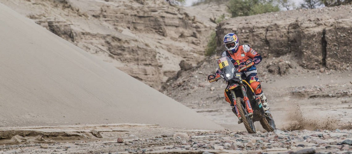 Ungefährdet hat der Salzburger KTM-Pilot Matthias Walkner am Mittwoch seine Gesamtführung bei der „Rallye Dakar“ behauptet. Als Sieger des Vortages ging der 31jährige Österreicher als Erster in die 11. Etappe, die 484 Kilometer von Belén nach Chilecito führte; 280 Kilometer wurden als gezeitete Sonderprüfung gewertet. Matthias Walkner fuhr kontrolliert ins Ziel und verlor als Fünfter des Tages 11.01 Minuten auf Tagessieger Toby Price, seinen Teamkollegen im österreichischen „Red Bull KTM Rally Factory Racing Team“. Mit dem Franzosen Antoine Meo auf Rang 3 brachte das rot-weiß-rote Team einen weiteren Piloten auf das Etappen-Podium. Dazwischen platzierte sich der Spanier Kevin Benavides (Honda) als Tages-Zweiter.