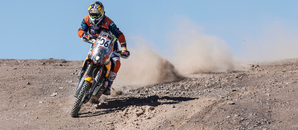 Motorrad-Pilot Matthias Walkner kommt bei der „Attacama Rally“ in Chile immer besser in Fahrt. Auf der vierten und längsten Etappe am Donnerstag kam Walkner als Etappen-Dritter und damit bester Pilot des „Red Bull KTM Rally Factory Racing Team“ in Tagesziel. Insgesamt waren 547 Kilometer von Mejillones nach Iquique zu bewältigen, 375 Kilometer davon ging es als Sonderprüfung mit Vollgas gegen die Uhr.