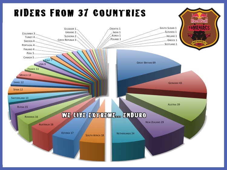 Hermannstadt / Sibiu, Rumänien, 15. Mai 2015 – Die Red Bull Romaniacs gehen in die heisse Phase vor dem Rennen: Bereits in ca. acht Wochen treffen die besten Extrem-Enduro Fahrer der Welt in Sibiu ein. Fahrer aus 37 Ländern werden sich dann ihrer härtesten Prüfung des Jahres stellen und versuchen, die 4 Renntage plus Prolog zu überstehen. Zusammen mit den Familien und Service-Crews wird der Renn-Zirkus mit ca. 1200 Enduro-infizierten die Stadt im Herzen Transsilvaniens auf den Kopf stellen. Der grösste Teil der Fahrer kommt aus England, Deutschland und Österreich, dicht gefolgt von Neuseeland, den Niederlanden und Südafrika. Die exotischsten Länder sind Indien, Korea, Süd-Sudan und Ecuador.