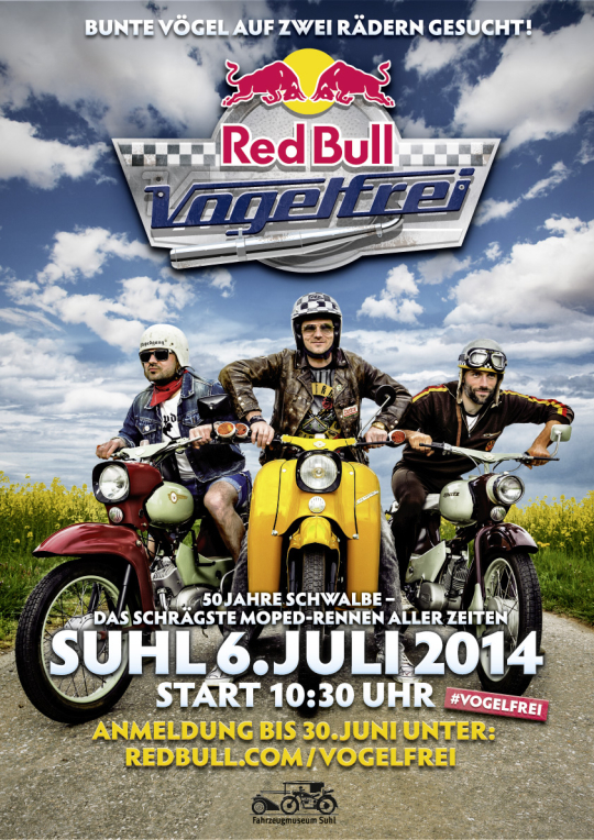 Die Mopeds mit den Namen heimischer Vogelarten waren das angesagteste Fortbewegungsmittel der 80er und 90er Jahre und haben mittlerweile Kultstatus. Jetzt ist es für diese Liebhaber an der Zeit, die bunten Zweiräder aus ihren Winterquartieren zu holen und für Red Bull Vogelfrei, das schrägste Rennen des Jahres, zu rüsten. Die 50 Kilometer lange Rundfahrt startet am 6. Juli auf dem „Platz der deutschen Einheit“ in Suhl. Dabei sind die Pferdestärken sekundär. Angelehnt an das legendäre Sechs-Tage-Enduro-Rennen aus der Region gilt es, sechs Stationen anzufahren, um dort Wertungs-Prüfungen zu meistern. Da bei Red Bull Vogelfrei aber nicht nur sportlicher Ehrgeiz gefragt ist, sondern es vielmehr eine Art „Ausfahrt“ für echte Vogel-Liebhaber ist, gilt es unter anderem eine „Geh-Kraft“-Prüfung an einem Steil-Stück der Strecke oder eine Reife(n)-Prüfung zu meistern. Ebenso erhält der Pilot einen Preis, der bei seiner Ausfahrt der ermittelten Durchschnittsgeschwindigkeit aller Teilnehmer am nahsten kam. Also Raser aufgepasst, es gibt Radarfallen auf der Strecke, die die Geschwindigkeit messen.