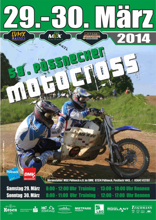 Am 29. und 30. März geht die Outdoor Saison wieder los. Dabei startet die Landesmeisterschaft Sachsen und die LVMX-Masters mit den Klassen Seitenwagen und Quad zum ersten mal in Thüringen beim MSC Pößneck. Dabei haben sich rund 400 Fahrer angemeldet, um die ersten Punkte der neuen Saison zu kämpfen. Neben der Landesmeisterschaft starten auch die Fahrer der Nordbayern Serie in die Saison so wie die Fahrer der Quad und Seitenwagen der LVMX-Masters.