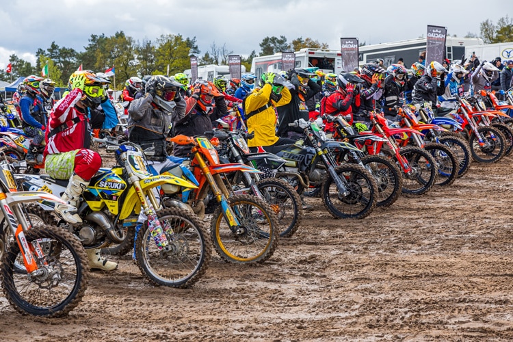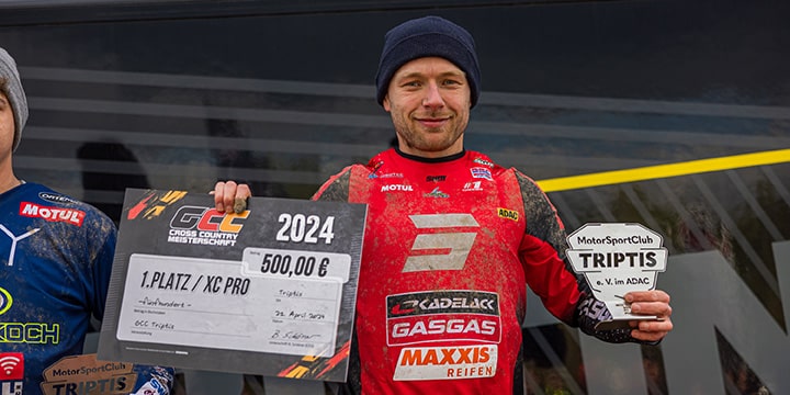 Das Highlight des Sonntages war wie gewohnt der letzte Lauf des Tages. Hier starten bekanntermaßen die Top Stars der deutschen Cross Country Szene. Neben der Proklasse gehen auch die Cracks aus den Sportklassen auf die Strecke. Die Strecke war für den letzten Lauf weiterhin in einem guten Zustand. Den Holeshot des Teilnehmerfeldes sicherte sich Ernest Krispel (Enduro Koch Racing/ Winkler Suspension) gefolgt von seinem Teamkollegen Niklas Niegelhell und Leonard Koch (Enduro Koch Racing/ Winkler Suspension). Lauf der ersten Runde entwickelte sich ein heißer Zweikampf zwischen den beiden mit mehreren Führungswechseln. Yanik Spachmüller (Kadelack GASGAS/ MC Augsburg); Vorjahreszweiter in Triptis, schaute sich das Geschehen an der Front mit einem gleichbleibenden Abstand von etwa 5 Sekunden an und lauerte auf seine Chance. Titelverteidiger Chris Gundermann (Finkmoto Holzgerlingen) erwischte einen eher gebrauchten Beginn des Rennens. Bereits in der dritten Runde musste er in der Box sein Hinterrad wechseln und nahm dann von Platz 7 die Verfolgung auf. In Runde 7 sprengt Yanik Spachmüller das Duo an der Spitze und heizte Ernest Krispel direkt am Hinterrad richtig ein. Nachdem Koch und Krispel Ihre Boxenstopps absolviert hatten setzte sich Spachmüller an die Spitze des Feldes. Währenddessen holte Multi-Champ Gundermann immer weiter auf und war zur Hälfte des Rennens bereits wieder auf Platz 4 nach vorne gefahren. Von den knapp 2,5 Minuten Rückstand auf die Spitze waren gerade mal etwas mehr als über eine Minute übrig. Der amtierende Meister fuhr in der zweiten Hälfte des Rennens weiter wie entfesselt und holte Runde um Runde auf. Drei Runden vor Schluss war es dann soweit. Gundermann schnappte sich die Führung von Spachmüller. Doch es war noch nicht Schluss. In der vorletzten Runde nahm das Rennen nochmals eine dramatische Wende. Gundermann musste unplanmäßig außerhalb der Strecke tanken und wurde aufgrund des Regelverstoßes aus der Wertung genommen. So staubte am Ende Leonard Koch den silbernen Rang auf dem Podest ab. Koch entwickelt sich immer mehr zu einem Stammgast auf dem Podium, was er dieses Mal wieder eindrucksvoll unter Beweis stellte. Am Ende hatte er über zweieinhalb Minuten Rückstand auf Spachmüller. Der Österreicher Ernest Krispel konnte sich trotz Sturz noch den letzten Platz auf dem Podium sichern. Sein Rückstand war am Ende auf über viereinhalb Minuten auf den Sieger angewachsen.