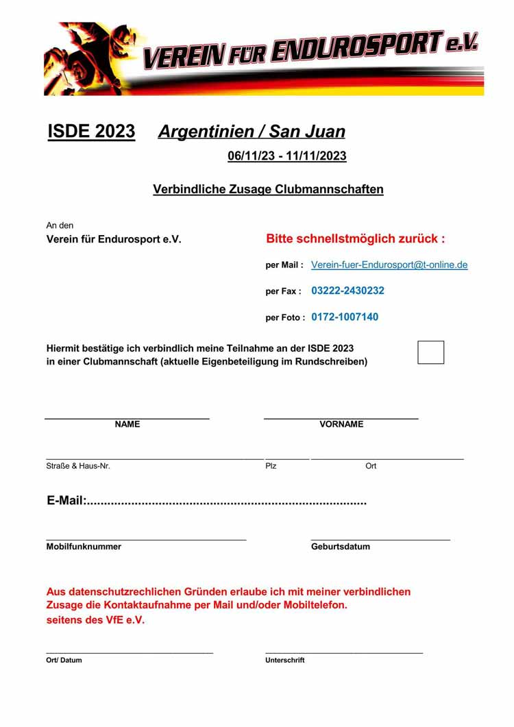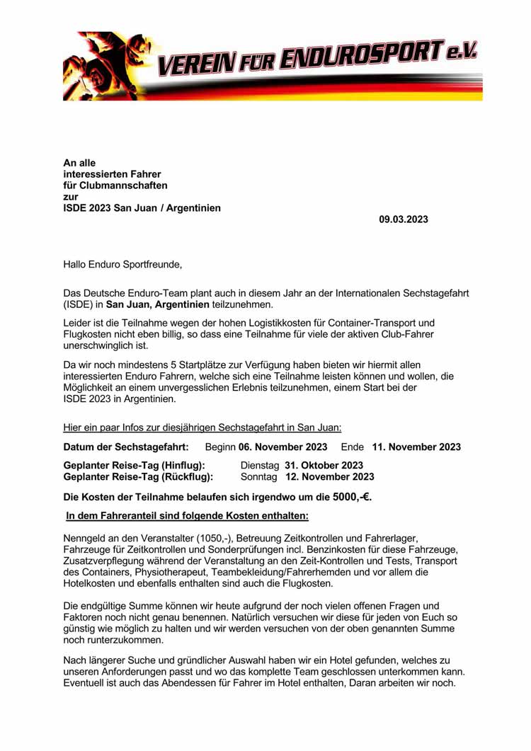 Für die diesjährige ISDE in San Juan / Argentinien vom 06.-11.11.2023 sind noch 5 Startplätze verfügbar. Solltest Du Interesse haben an diesem unvergesslichen Rennen ( Six Days 2023 ) teilzunehmen und ein Teil des Deutschen Teams sein möchtest, dann kannst Du Dich noch anmelden.