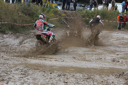 Nach nicht einmal 100m wurden die Piloten dann aber bereits das erstemal „geduscht“. Zwei große Wasserpfützen sorgten dafür das jeweils nur der Fahrer der den Start gewann halbwegs trocken dieses erste unschöne Hindernis meistern konnte.