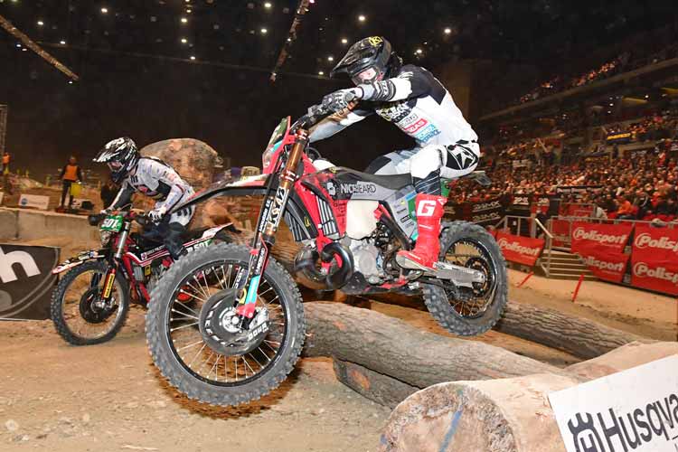 Wie üblich begann der Abend nach dem Opening sportlich mit besagtem Superpole-Qualifying, bei dem Billy Bolt wieder die schnellste Zeit markierte. Auch im ersten Lauf schien der Husqvarna-Factory-Pilot alles unter Kontrolle zu haben, bis ihm drei Runden vor Schluss ein auf der von Kornel Nemeth gestalteten Strecke eine etwas schwerwiegenderer Fehler unterlief und Taddy Blazusiak vorbei schlüpfte. In der verbleibenden Rennzeit ließ sich der GasGas-Treiber das Heft nicht mehr aus der Hand nehmen und gewann. Jonny Walker, ebenfalls aus Großbritannien und auf einer Beta unterwegs, wurde vor den beiden US-Amerikanern Colton Haaker (Husqvarna) und Cody Webb (Sherco) Dritter. Tim Apolle aus Billroda in Sachsen-Anhalt wurde im mageren nur neun Fahrer umfassenden Feld mit seiner Beta Achter.