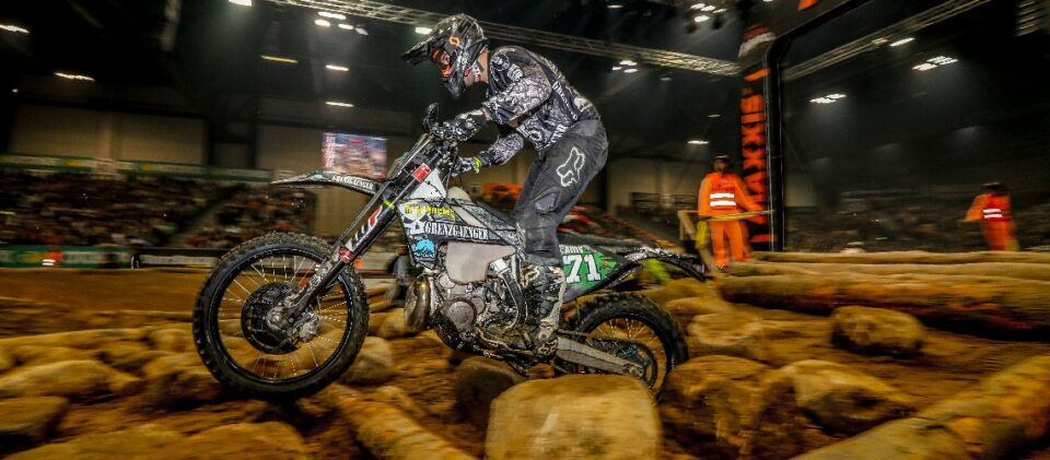 Im dritten Rennen – wieder in normaler Startreihenfolge – wählte Gallas erneut „seinen“ Platz an der inneren Bande. Mit einem Satz war er am ersten Baumstamm, kam als Zweiter an die großen Röhren und übernahm sofort die Führung. Die Halle tobte, die Fans jubelten, während Kevin Gallas seinen Vorsprung ausbaute. Noch einmal durch den Wassergraben, noch einmal über die Reifen, volle Konzentration im tückischen Steinfeld, den Rhythmus finden in den Whoops und noch einmal der Ritt über die Matrix. Dann der Zielsprung – die Sensation war perfekt.