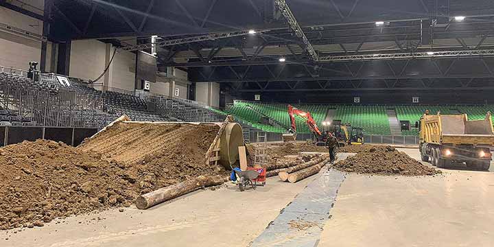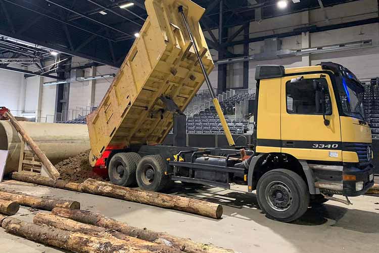 Pünktlich 8:00 Uhr rollte am Dienstagmorgen der erste mit feinstem SuperEnduro-Dirt beladene LKW in die SACHSENarena Riesa, um selbigen dort abzuladen. Am Ende werden es rund 1.000 Tonnen Erde und 150 Tonnen Sand sein. Garniert wird die bisher stets und von den meisten Fahrern und Verantwortlichen gelobte Riesaer Strecke auch in diesem Jahr mit rund 200 großen Flusssteinen, 200 Baumstämmen, 200 Holzscheiten und 20 Dumper-Reifen.