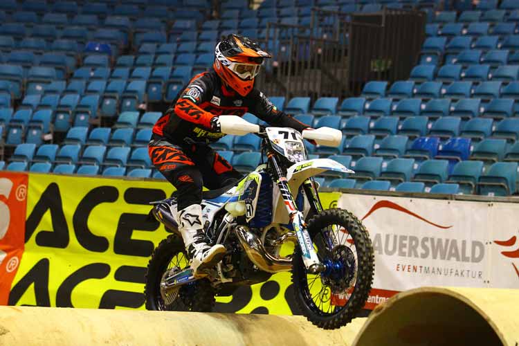 „Es ist eine absolut coole Strecke. Holger (Dettmann, der Streckenbauer, Anm. d. Red.) hat sich mal wieder selbst übertroffen“, schwärmte der 22-Jährige Badener anschließend und erhöhte damit die Vorfreude aller direkt und indirekt Beteiligter auf das zu erwartende SuperEnduro-Fest am Samstag, dem 5. Januar, in der SACHSENarena Riesa. Danach ging er mit folgenden Worten ins Detail: „Mit den zwei Rampen über dem einen Steinfeld gibt es in Riesa mal wieder ein Novum im SuperEnduro. Auch die zwei unmittelbar aufeinanderfolgenden Wasserbecken werden etwas ganz Besonderes sein. Ansonsten ist die Strecke sehr flüssig und bietet viele gute Überholmöglichkeiten. Ich bin mir sicher, dass wir spannende Rennen sehen werden.“