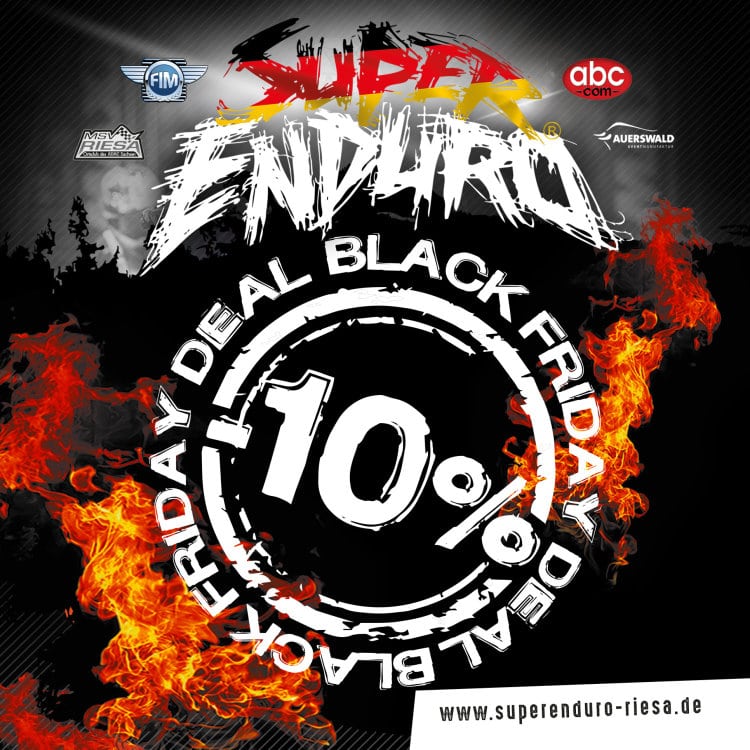 Am kommenden Freitag steht die Welt wieder Kopf – dann ist erneut „Black Friday“. Da wollen die Macher hinter dem SuperEnduro Riesa, die Auerswald Eventmanufaktur, nicht nachstehen und bieten spätentschlossenen Fans und Schnäppchenjägern für den deutschen WM-Lauf am Samstag, dem 4. Januar 2020, zehn Prozent Nachlass auf noch verfügbare Tickets. Das Angebot gilt vom (schwarzen) Freitag bis Sonntag (29. November bis 1. Dezember 24.00 Uhr), allerdings ausschließlich für den Ticket-Online-Shop. Wer also bei der sechsten Ausgabe dieses Offroad-Spektakels der Extraklasse dabei sein will, klickt an den kommenden Tagen auf: https://www.etix.com/ticket/p/3296077/superenduro-riesa-2020-riesa-sachsenarena-riesa?campaign_id=5477C476F7DBB76CC8589C94E2064885