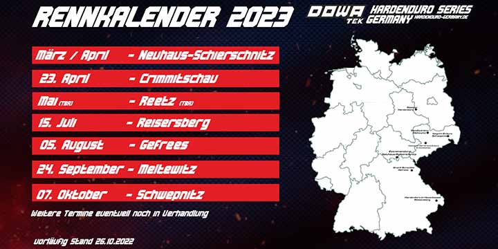 Der Kalender der Saison 2023 von Deutschlands einziger Hardenduro Meisterschaft wird immer konkreter. Mittlerweile sind auch die Termine für das Rennen in Crimmitschau, Gefrees und Schwepnitz fixiert.