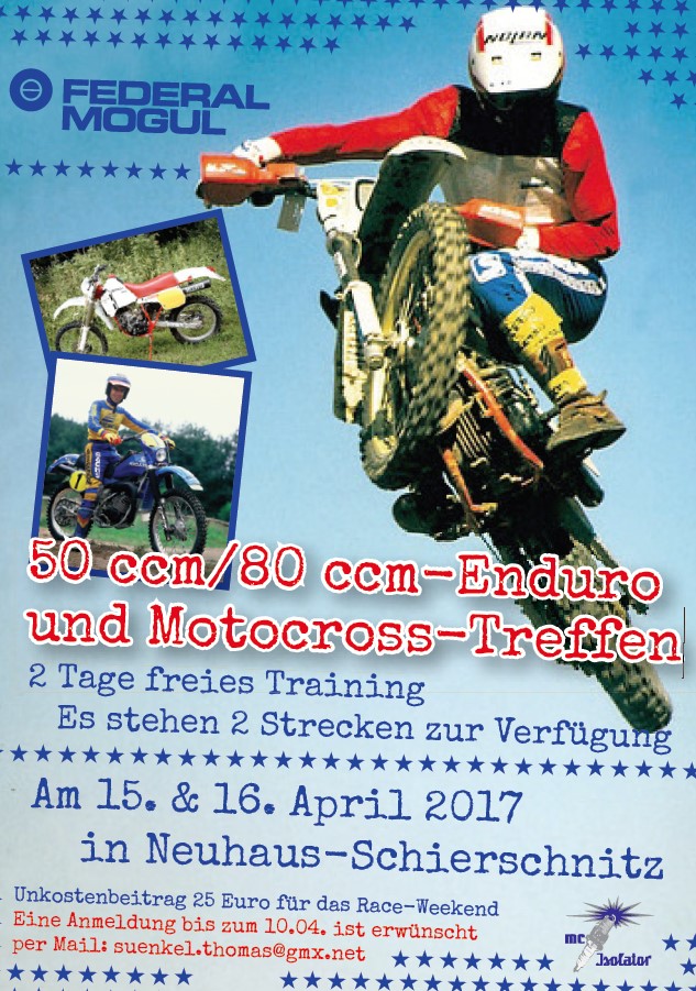 Am 15./16.04. findet ein 50 ccm/80 ccm-Enduro und Motocross-Treffen. Zu diesem freien Training gibt es zwei Streckenmöglichkeiten zum trainieren.