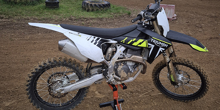 Die Triumph TF 250 X ist eine komplette Eigenentwicklung, die wenig Teile aus Fremdproduktionen beinhaltet. Der 250ccm-Motor bringt beeindruckende 48 PS auf die Strecke und das Modell wiegt nur 104 kg – ein echtes Leichtgewicht in dieser Klasse. Mit hochwertigen Komponenten wie einem Kayaba-Fahrwerk, voll einstellbaren Dämpfern, einer Brembo-Bremsanlage und Pirelli Scorpion MX 32 Reifen ist das Motorrad bestens ausgestattet.
