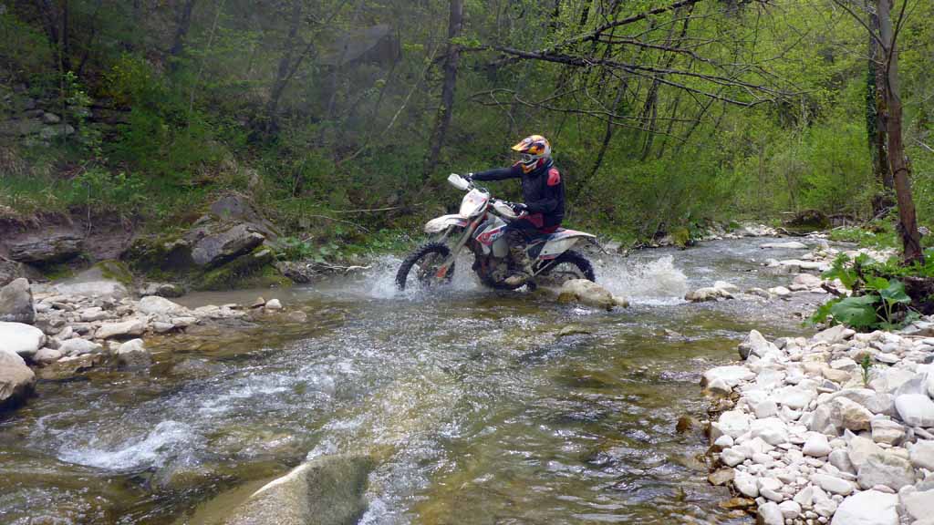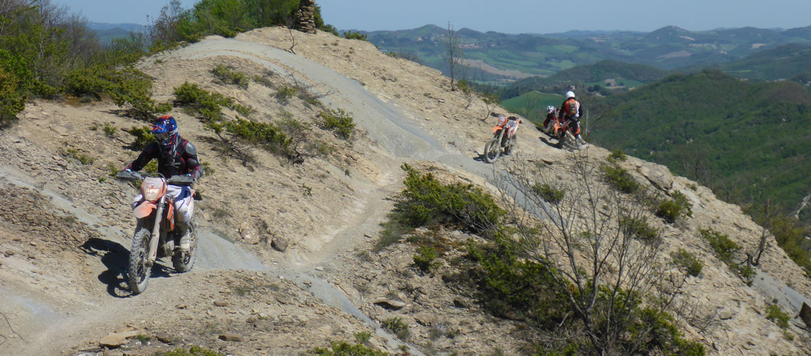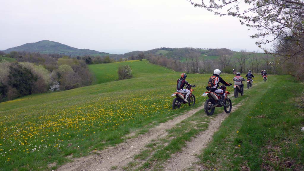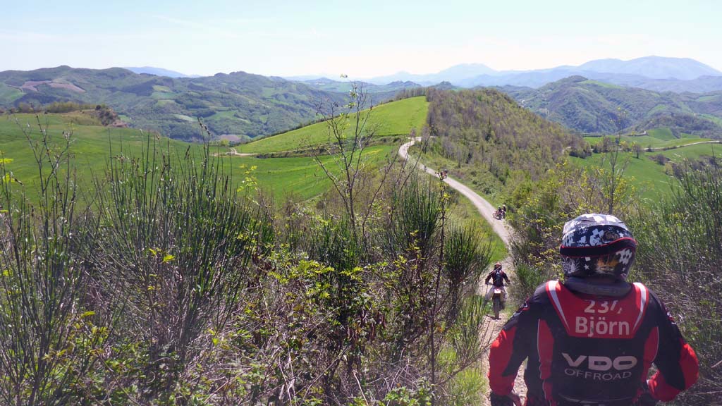 Im Herzen des Apennin, wo die Gebirge der Emilia-Romagna, der Toskana und der Marken zusammentreffen, tauchen wir ab in ein sattes Grün fernab vom Alltag und erkunden die hügelige bis bergige Landschaft. Vom Tourismus weitgehend verschont kann man in dieser Gegend ein Stück unverfälschtes Italien finden. Eine Tour im Hinterland der italienischen Adria kommt einer Zeitreise gleich: Bauernhäuser und kleine Gehöfte aus längst vergangenen Epochen eingebettet in eine wunderschöne und vielfältige Hügel- und Berglandschaft, uralte Wälder, gepflegte Obstplantagen und Kornfelder. Das Gelände bietet sowohl zügig befahrbare Schotterstraßen als auch fahrtechnisch anspruchsvolle Trails, sodass sowohl Anfänger als auch routinierte Endurofahrer hier voll auf ihre Kosten kommen. Am Abend genießen wir die gute italienischen Küche und das ein oder andere Glas Sangiovese im hoteleigenen Weinkeller. Unser gemütliches Vier-Sterne-Hotel im typisch italienischen Landhausstil liegt jeweils 15 km von San Marino und Rimini entfernt.
